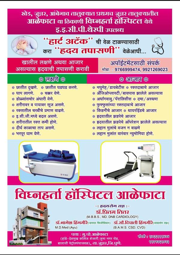 Vighnaharta Hospital in Alephata one of the best hospital with ICU Facility and Well Equiped Operation Theatre. We are specialise in Emergency Services, Heart Attack, Diabetes Treatment and all Infectious Diseases. We have facility of Pharmacy, Diagnostic Laboratory, Pathology Laboratory and 24/7 Ambulance Service. Also have facility of Cash less treatment for many Insurance Companies.